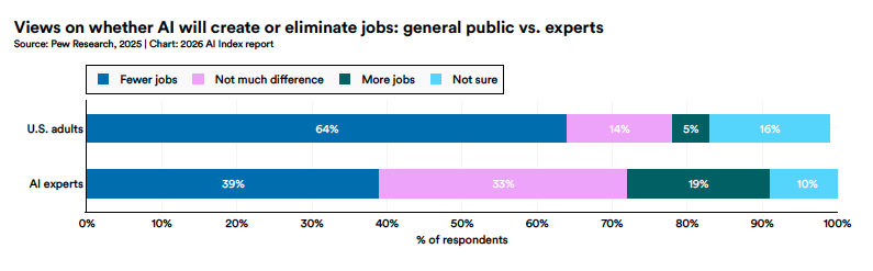 Stanford University’s 2026 AI Index exposes a massive divide between tech insiders and everyday workers. While 73% of AI experts expect the technology to positively impact jobs, 64% of Americans are actively bracing for job losses. With only 31% of the public trusting the government to regulate AI responsibly, the burden falls entirely on employers to manage the friction between executive enthusiasm and employee resistance.