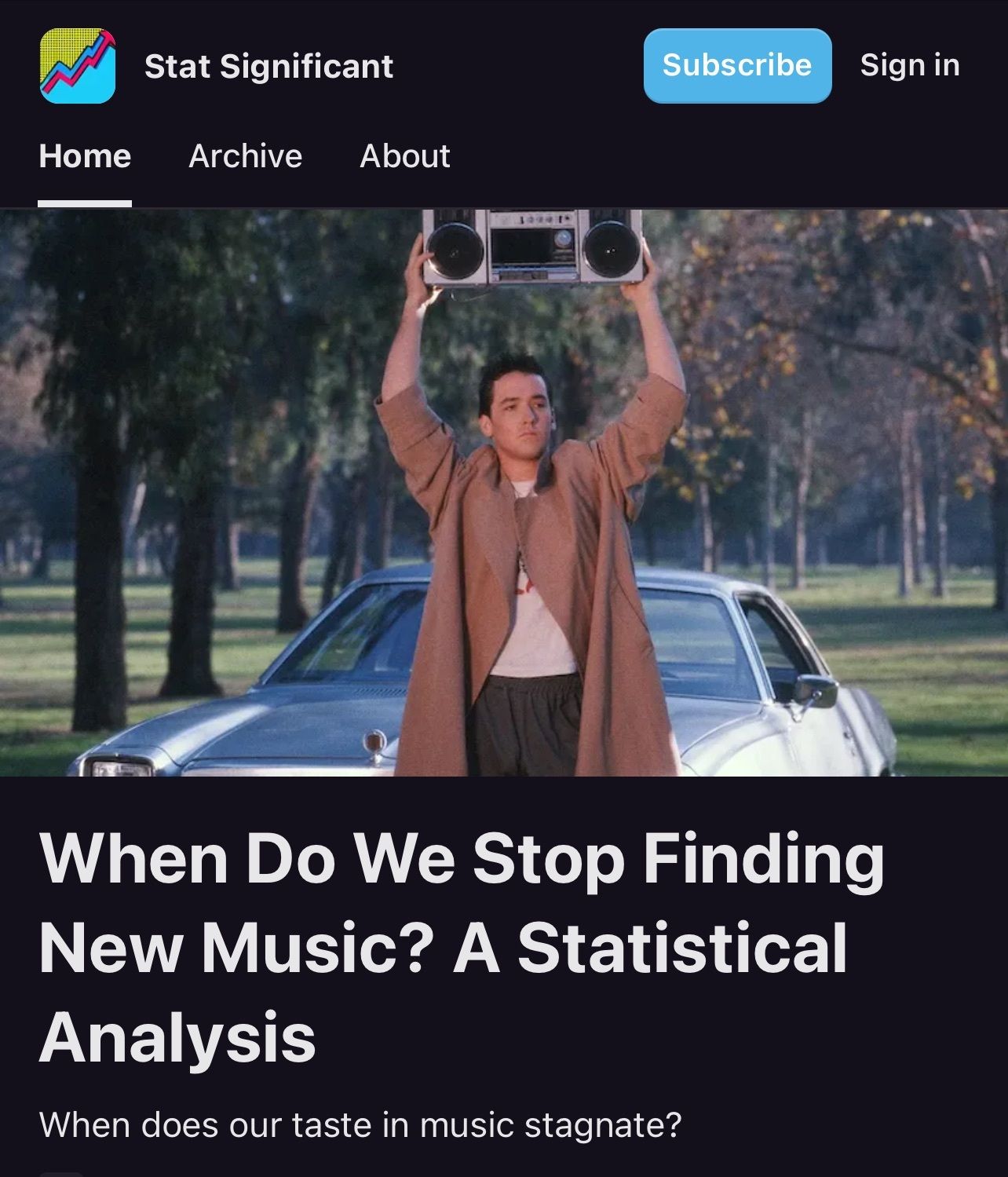 Stat Significant is a free weekly newsletter that masters the art of data storytelling. Each week, it dives into the data behind pop culture to uncover surprising cultural trends, answering questions like, "When do we stop finding new music?" and "How many episodes should you watch before quitting a TV show?".