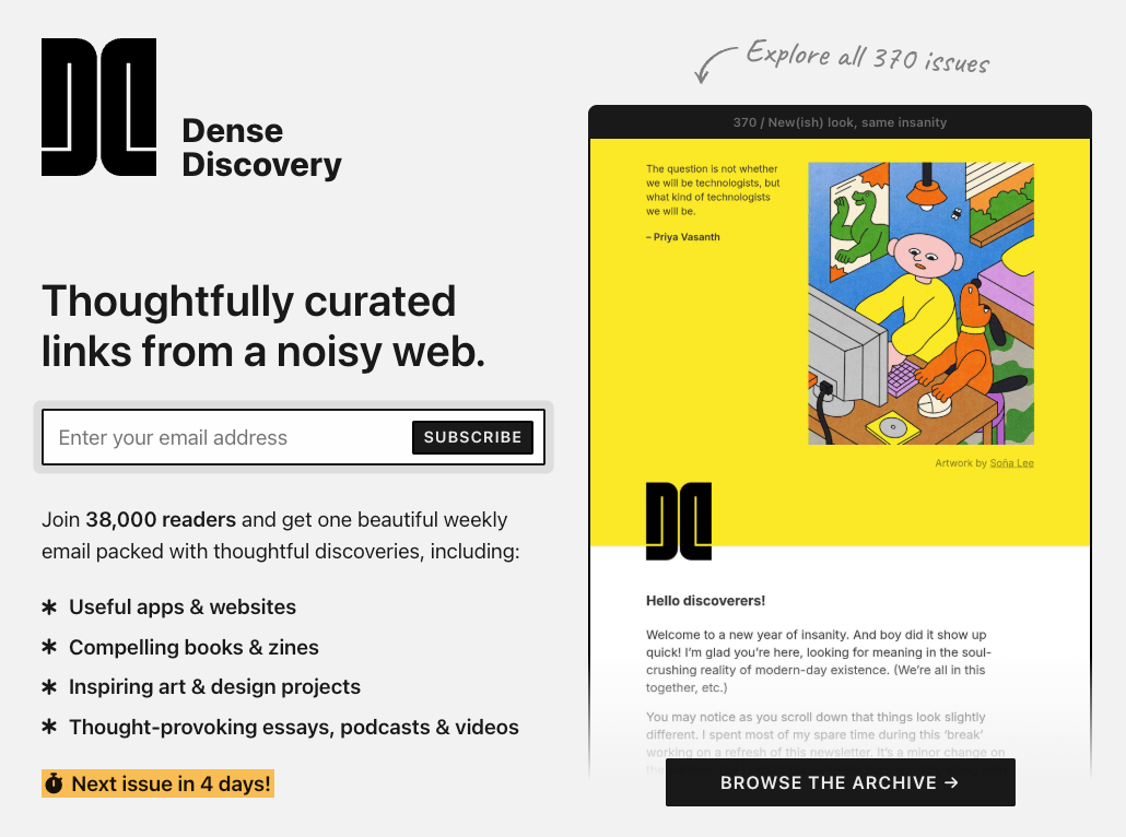 In a world of algorithmic noise, we're always searching for genuinely curated content. With over 350 issues, Dense Discovery it's a trusted source for thoughtful discoveries in tech, design, art, and culture. If you appreciate the content we share in Lighthouse, we think you'll love this too.